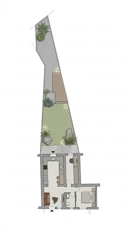 Porzione di terra-tetto con ingresso indipendente ed interamente sviluppato al piano terra. L'ottima superficie è suddivisa in un accogliente soggiorno d'ingresso, cucina abitabile con sfogo sull'ampio giardino interno, disimpegno zona notte, una camera matrimoniale, una camera doppia ed un bagno completo e finestrato, recentemente ristrutturato. Spazio esterno di proprietà per due posti auto. Riscaldamento a GPL. Buone condizioni generali